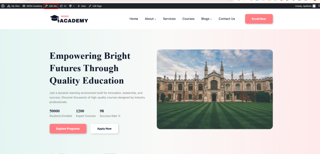 - Click on “Edit Site” to open the Site Editor.