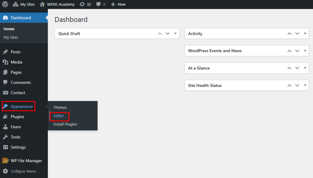 - Navigate to Appearance → Editor.