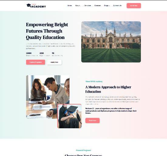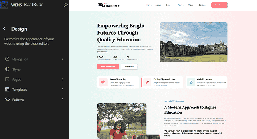 WENS Academy is a modern and versatile Full Site Editing (FSE) WordPress theme designed specifically for schools, colleges, training centers, and online learning platforms. As a child theme of WENS Haelo, it inherits the clean, responsive, and highly customizable structure of the parent theme while adding specialized templates such as Academy, Courses, and FAQ. These templates make it easy for educational institutions to showcase academic programs, provide detailed information about courses, and offer quick answers to student inquiries. With WENS Academy, users can build and customize every aspect of their website including headers, footers, and layouts directly through the WordPress Site Editor, without requiring any coding skills. Fully compatible with Gutenberg, this theme delivers block-based design flexibility, making it simple to create professional and visually appealing educational websites. The WENS Academy theme is lightweight, SEO-friendly, and translation ready, ensuring fast performance and accessibility across all devices. It is ideal for eLearning portals, coaching institutes, and universities, providing an elegant and functional foundation for delivering a seamless online learning experience.